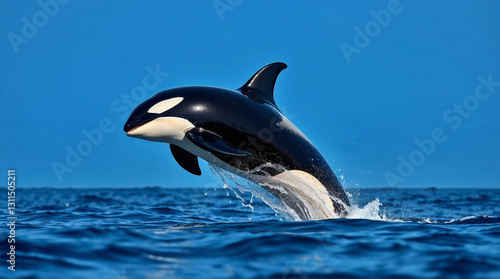 Fototapeta premium orca whale jumps out of the water with blue sky