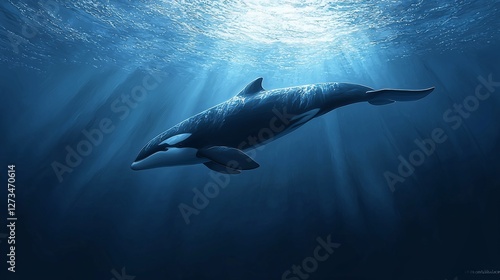 Fototapeta premium Orca whale swimming in sunlit ocean depths.