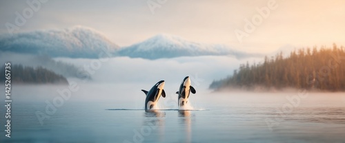 Fototapeta premium Orcas breaching in tranquil water. Mountains, trees, and mist create a scenic...