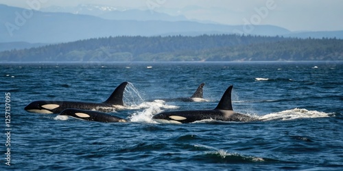 Fototapeta premium Orcas swim in school through the dark blue ocean, ocean creature, ocean...