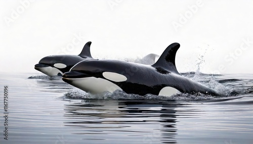 © blackdiamond67, Fototapeta premium Orcas swimming gracefully in calm waters, white isolate background.