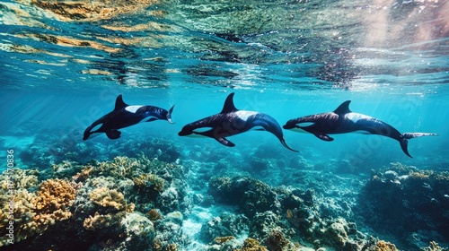 Obraz premium Orcas swimming gracefully over vibrant coral reef