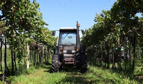 Fototapeta premium Orchard tractor inside a row of vineyard during the grape harvest in early...