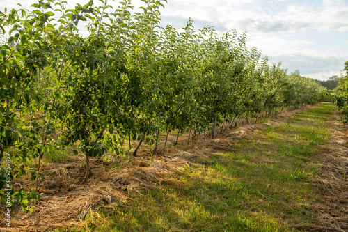 Fototapeta premium Orchard with young apple trees. Harvest time.