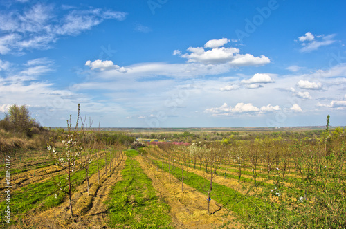 © banepetkovic, Fototapeta premium Orchards in bloom by Danube river at early spring