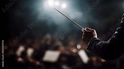 © Thares2020, Naklejka premium Orchestra conductor leading a performance with baton and sheet music in concert hall lighting