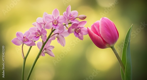 © kapten, Fototapeta premium Orchid branch and pink tulip bloom against blurred natural background