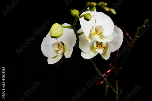 © Nikolay, Obraz premium Orchid flower blossom isolated on the black background with copyspase for cards and design.