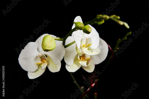 © Nikolay, Obraz premium Orchid flower blossom isolated on the black background with copyspase for cards and design.