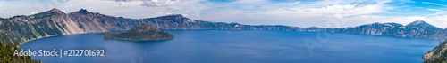 © LeePhotos, Fototapeta premium Oregon Crater Lake panorama with boat from wizard island