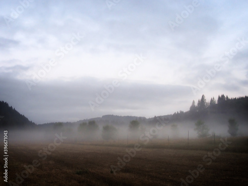 Fototapeta premium Oregon summer foggy dawn and fenceline