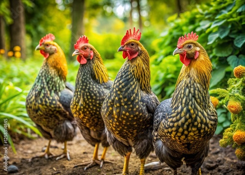 © Danicha, Fototapeta premium Organic Backyard Chickens: Black Yellow Laced Wyandotte Hens in a Row