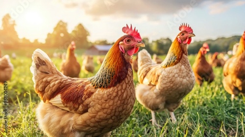 © NATTAWUT, Fototapeta premium Organic chickens roaming freely in a large open pasture on a sustainable farm