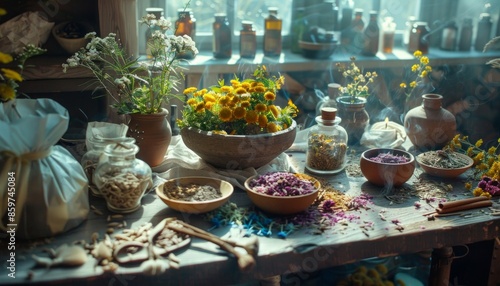 © Mark, Fototapeta premium organic cosmetics, dried herbs, soothing incense promote