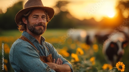 © Morng, Obraz premium Organic farmer standing in a field of wildflowers, promoting biodiversity on the farm