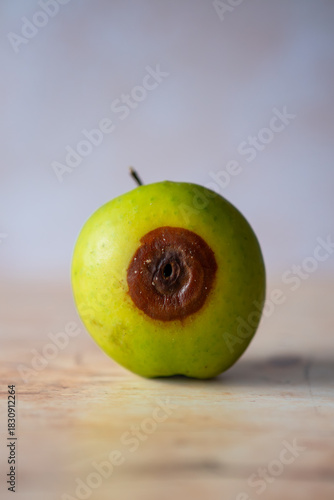 Fototapeta premium Organic green apple with a borehole (tunnel) and concentric brown circles, Codling Moth infestation