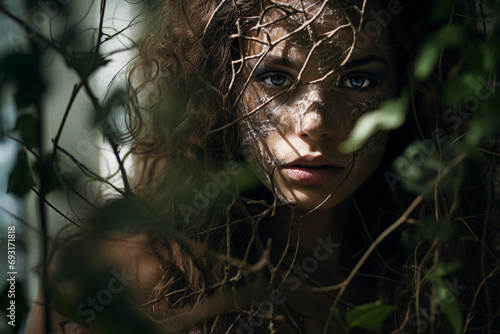 Obraz premium organic materials, subject's face partially obscured by branches and leaves