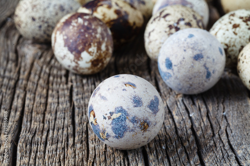 © Andrey Cherkasov, Obraz premium Organic quail eggs on rustic wooden table