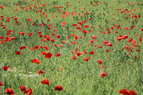 © ClaraNila, Fototapeta premium Organic rapeseed cultivation, field with many poppy flowers in Germany