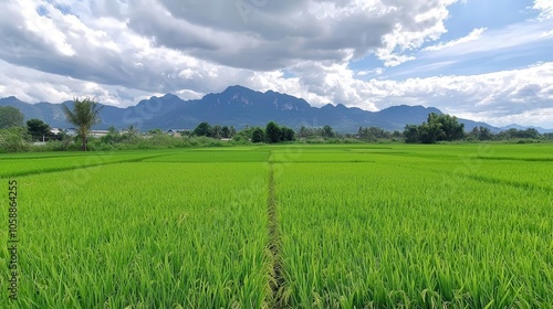 Fototapeta premium Organic rice fields with mountain backdrop and cloudy sky, natural beauty, organic rice field, rural scenery