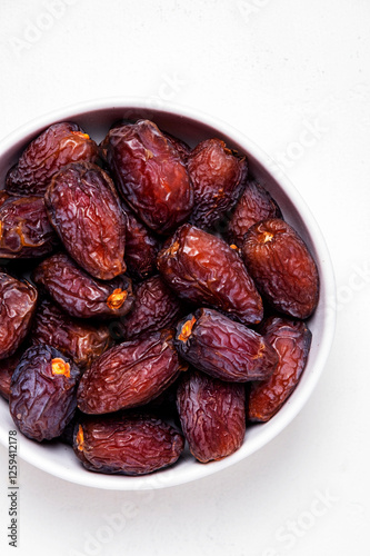 © 5ph, Obraz premium Organic sun dried royal dates in bowl on white background, top view