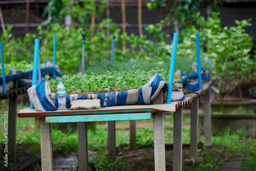 Naklejka premium Organic Vegetable Seedlings Growing in a Mulched Garden