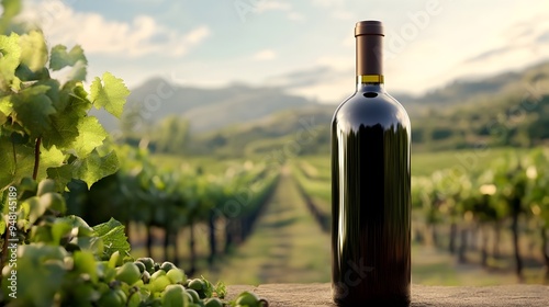 © pkproject, Fototapeta premium Organic Wine Bottle with Vineyard Background in 3D