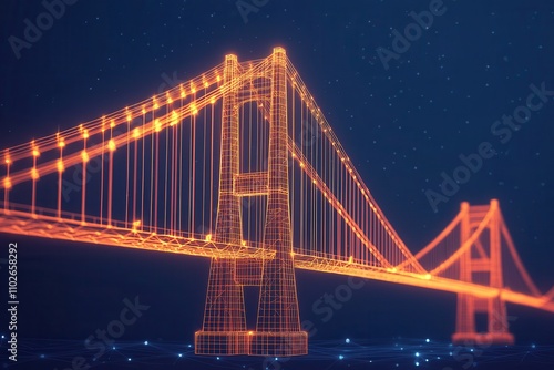 © Nitchalee N., Naklejka premium Organization structure and mission, A digital representation of a bridge illuminated in orange light against a dark background, showcasing a modern artistic interpretation of structural engineering.