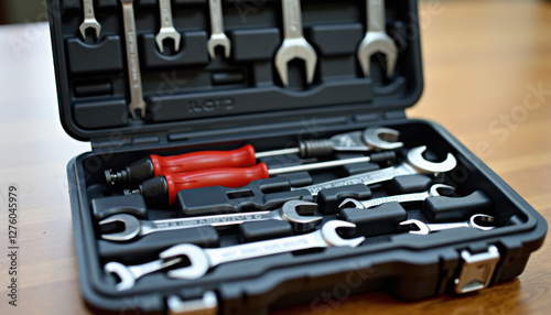 Fototapeta premium Organized Black Toolbox with Mixed Tools for Professional Maintenance Work