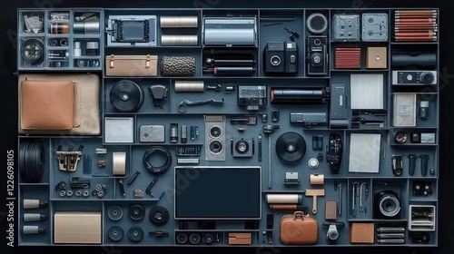 © ROY, Obraz premium Organized collection of various tech and audio equipment neatly arranged in a tray.