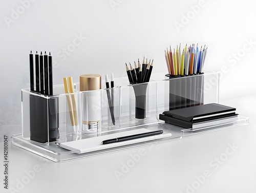 © Suhaimee, Obraz premium Organized desktop stationery desk accessories with pens pencils notebooks and storage containers for workspace and office supplies