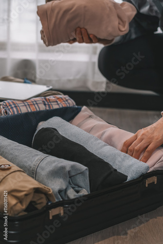Fototapeta premium Organizing and Packing Clothes for Travel in a Stylish Suitcase