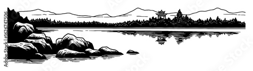 © Reytr, Naklejka premium Oriental Black and White Outline Line Art Drawing of Empty Lake Rocks Landscape with Chinese Pagoda and Mountains