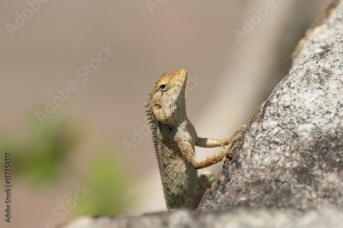 Fototapeta premium Oriental garden lizard (Calotes versicolor) sitting on a stone