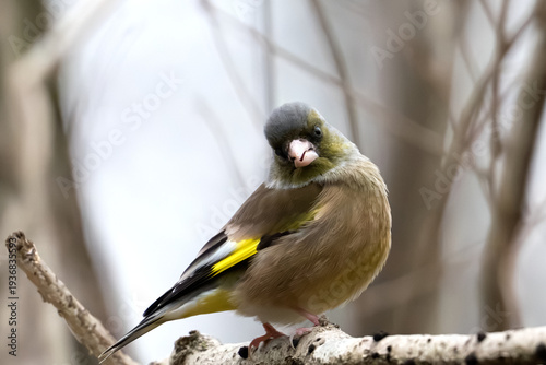 © KaWataru, Obraz premium Oriental greenfinch (Chloris sinica) tilting its head on a branch with copy space.