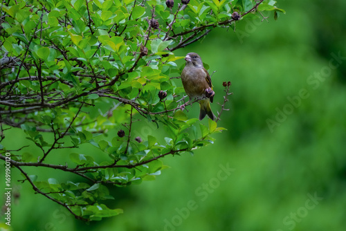 © Cheng, Fototapeta premium Oriental Greenfinch perched on green tree branch Kyoto Imperial Palace