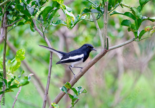 Fototapeta premium Oriental magpie robin, Copsychus saularis, bird hold on branch