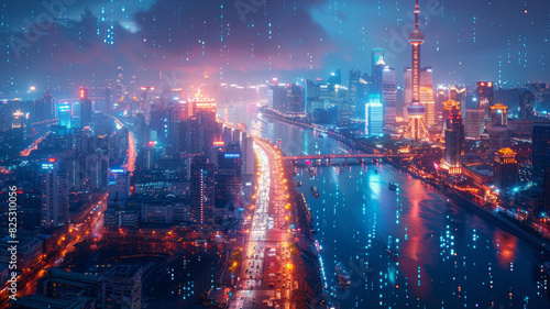 Fototapeta premium Oriental Pearl, Bund, Shanghai, Cyberpunk, information flow, technological...