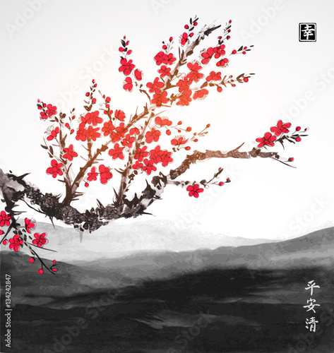 Fototapeta premium Oriental sakura cherry tree in blossom and landscape with far mountains. Traditional oriental ink painting sumi-e, u-sin, go-hua. Contains hieroglyphs - peace, tranquility, clarity