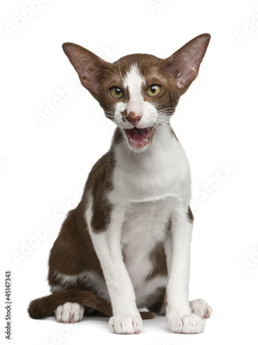 Obraz premium Oriental shorthair sitting and meowing against white background
