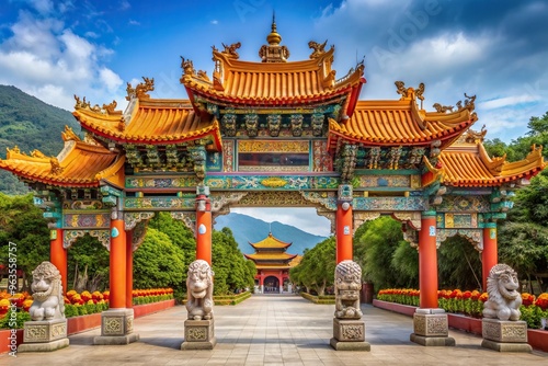 © Chanchai, Fototapeta premium oriental, Taiwan, decoration, Asia, architecture, ornate, archway, Nantou, colorful,Chinese lion, Taiwanese culture, Chinese lion decorated archway at Wen Wu Temple in Nantou Taiwan