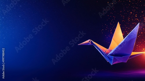 © Gefo, Naklejka premium Origami crane in blue and orange with sparkling background effect