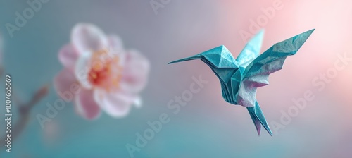 © spyrakot, Fototapeta premium Origami Hummingbird Hovering Near Flower with Pastel Background