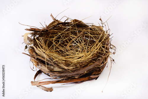 © halitomercamci, Obraz premium original bird's nest. A real bird's nest made by a bird from dried plant parts. on a white background.