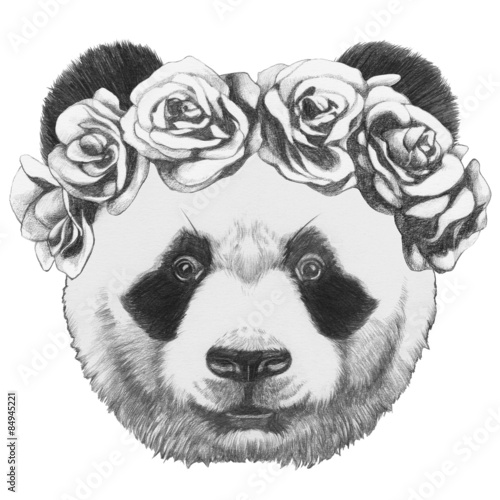 © Victoria Novak, Obraz premium Original drawing of Panda with roses. Isolated on white background