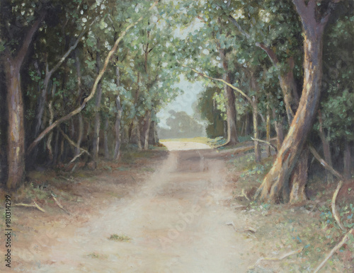 © Madele, Fototapeta premium Original oil painting on canvas - Lane of sun-dappled tall trees arched in the shade next to country dirt road in South Africa with sunlight in the distance