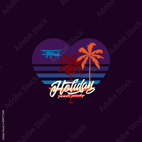 © artmarsa, Naklejka premium Original vector illustration. Palm trees and a plane on the background of a retro sunset in the shape of a heart in the style of the 80s. T-shirt design, design element.