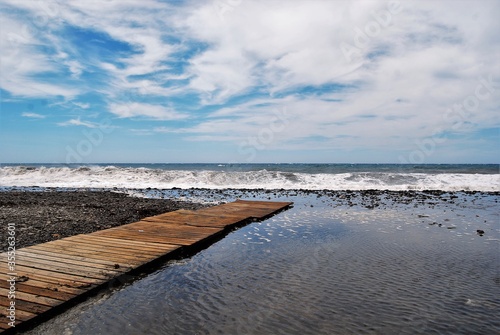 © Jose, Fototapeta premium Orilla del mar con pequeña pasarela de madera