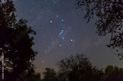 Fototapeta premium Orion constellation on the night starry sky between dark tree silhouette,...