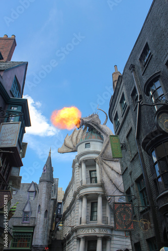 Naklejka premium Orlando, FL, USA. August 15, 2016: Dragon at the top of the Gringotts Bank. Harry Potter World at Universal Studios